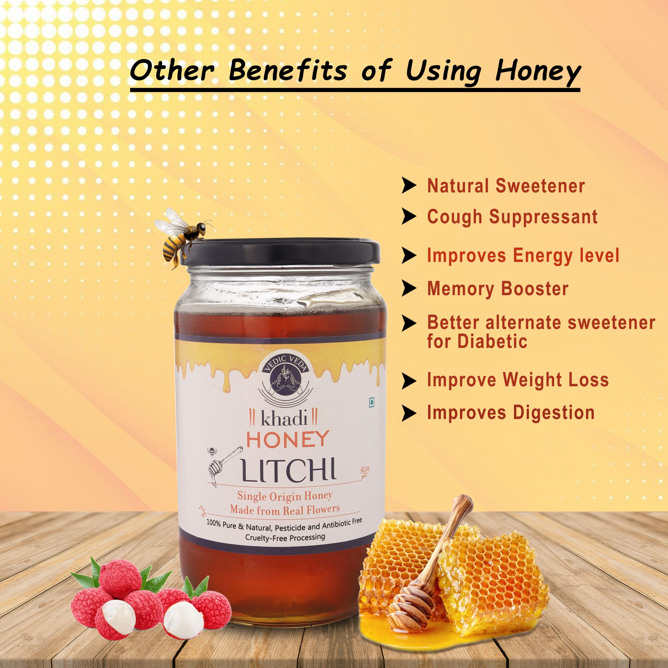 - Versatile Use: Perfect for a variety of culinary applications, Khadi Vedicveda Litchi Honey can be used to sweeten drinks, as a spread on bread, or as an ingredient in cooking and baking.